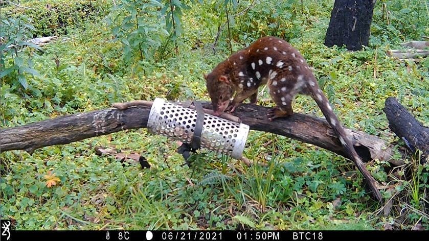 During a 12-month study in northern Morton National Park, they installed 30 Reconyx Hyperfire cameras along the Yarramunmun Fire Trail, baited with chicken drumsticks and positioned near fallen logs — a favourite quoll waypoint.