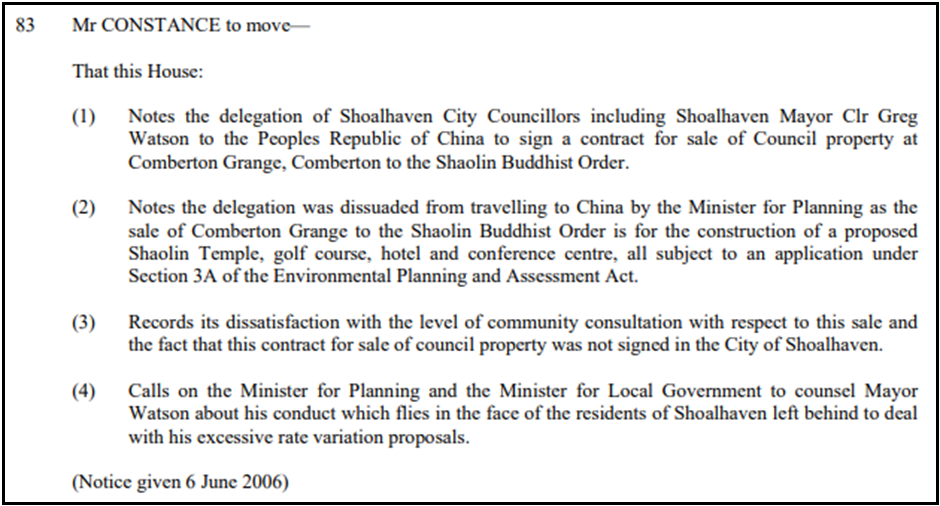 In a June 2006 motion to NSW Parliament, Constance called on the Ministers for Planning and Local Government to haul then-Mayor Greg Watson over the coals for his extravagant trip to China with other councillors to secure the sale of Comberton to Shaolin's top Buddhist monk.