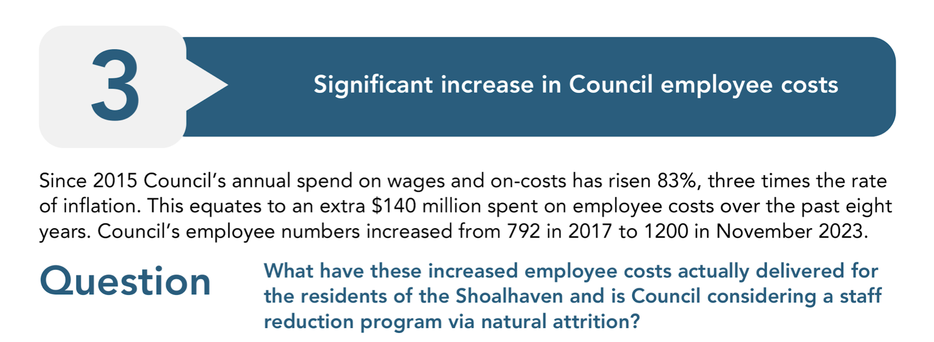 Coughlan, as far back as January 2024, spoke at community meetings about reducing staff numbers in Council and published and distributed as part of a "collective of Shoalhaven ratepayer financial professionals" a 9-point plan to address council's financial woes. Point 3 (with questionable statistics) raised staff reductions: