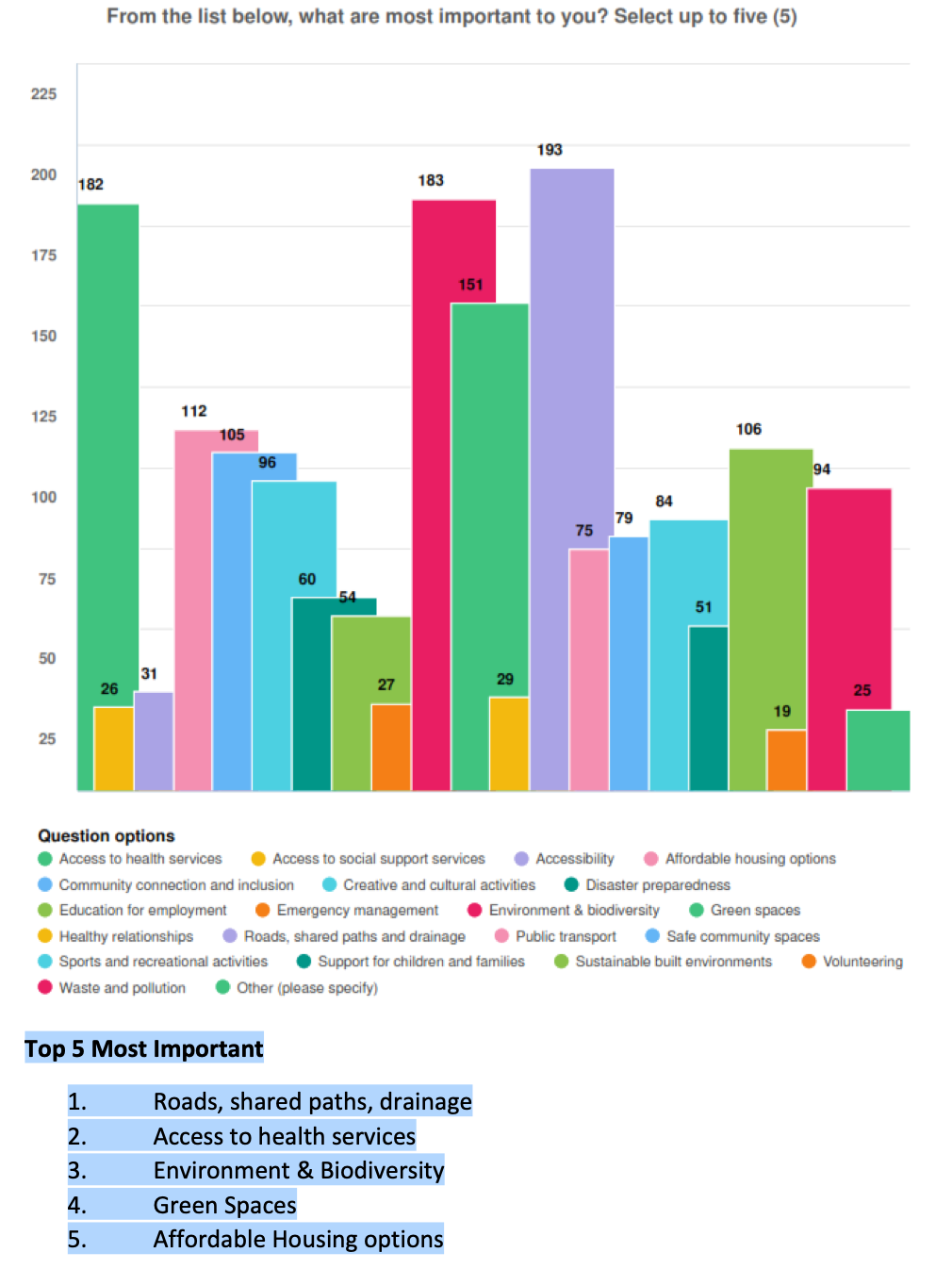 Of the top five out of 21 options, Environment & Biodiversity was at no. 3 and Green Spaces at no. 4, close behind Roads and Health Services, but well ahead of Affordable Housing that came in fifth.