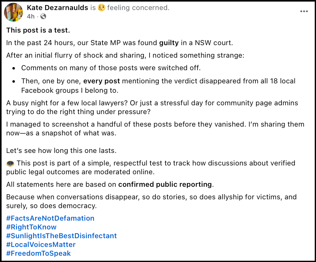 "In the last 24 hours, I’ve observed the same pattern across more than 20 community Facebook groups in our region: first, comments being turned off, then entire posts being deleted — even when those posts simply link to ABC coverage," said Dezarnaulds, a sexual assault survivor herself who was driven to enter politics by Ward's attempts to silence her public statements about him.