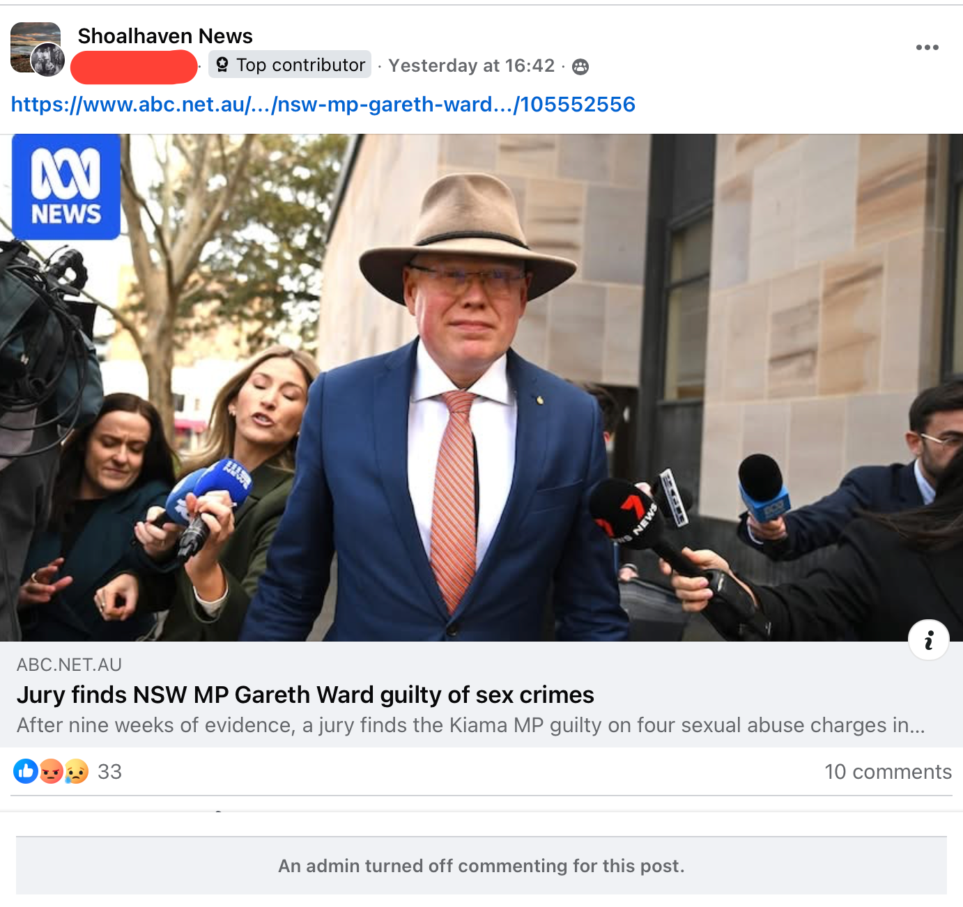 "This man called me a 'waste of space' on social media before blocking me. Now who's the 'waste of space', Gareth?" wrote one commenter in the Shoalhaven News Facebook group to a post of Friday's ABC story on Ward's guilty verdict.