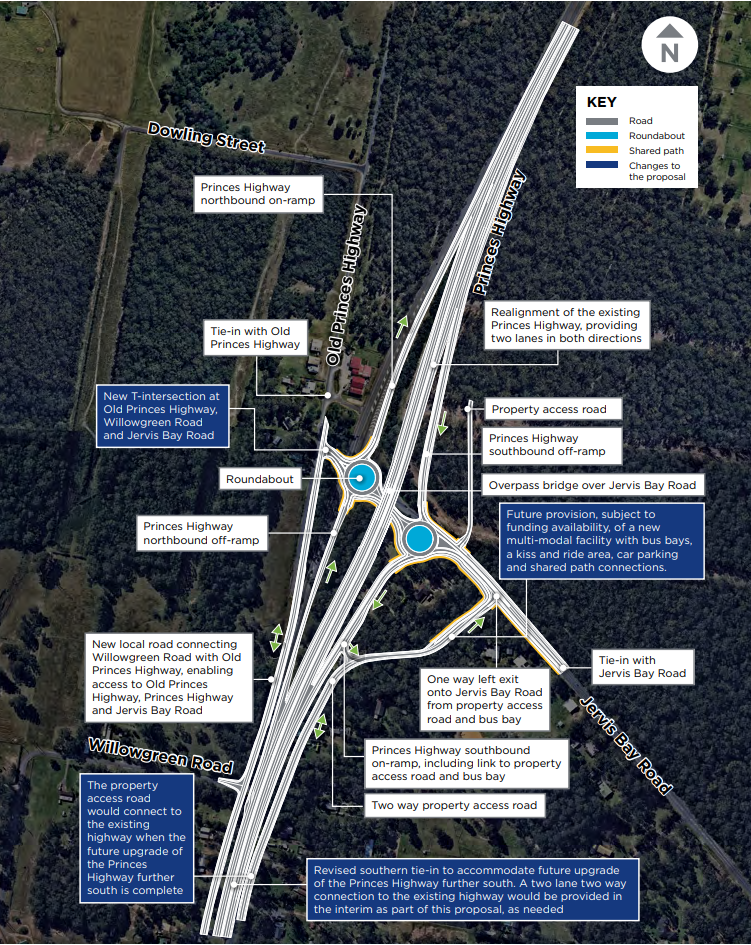 The $164 million project, jointly funded by the Australian Federal and New South Wales governments, will see the construction of a grade-separated "flyover", allowing highway traffic to bypass Jervis Bay Road via an overpass. Roundabouts on either side of the intersection will facilitate smooth local traffic movement.